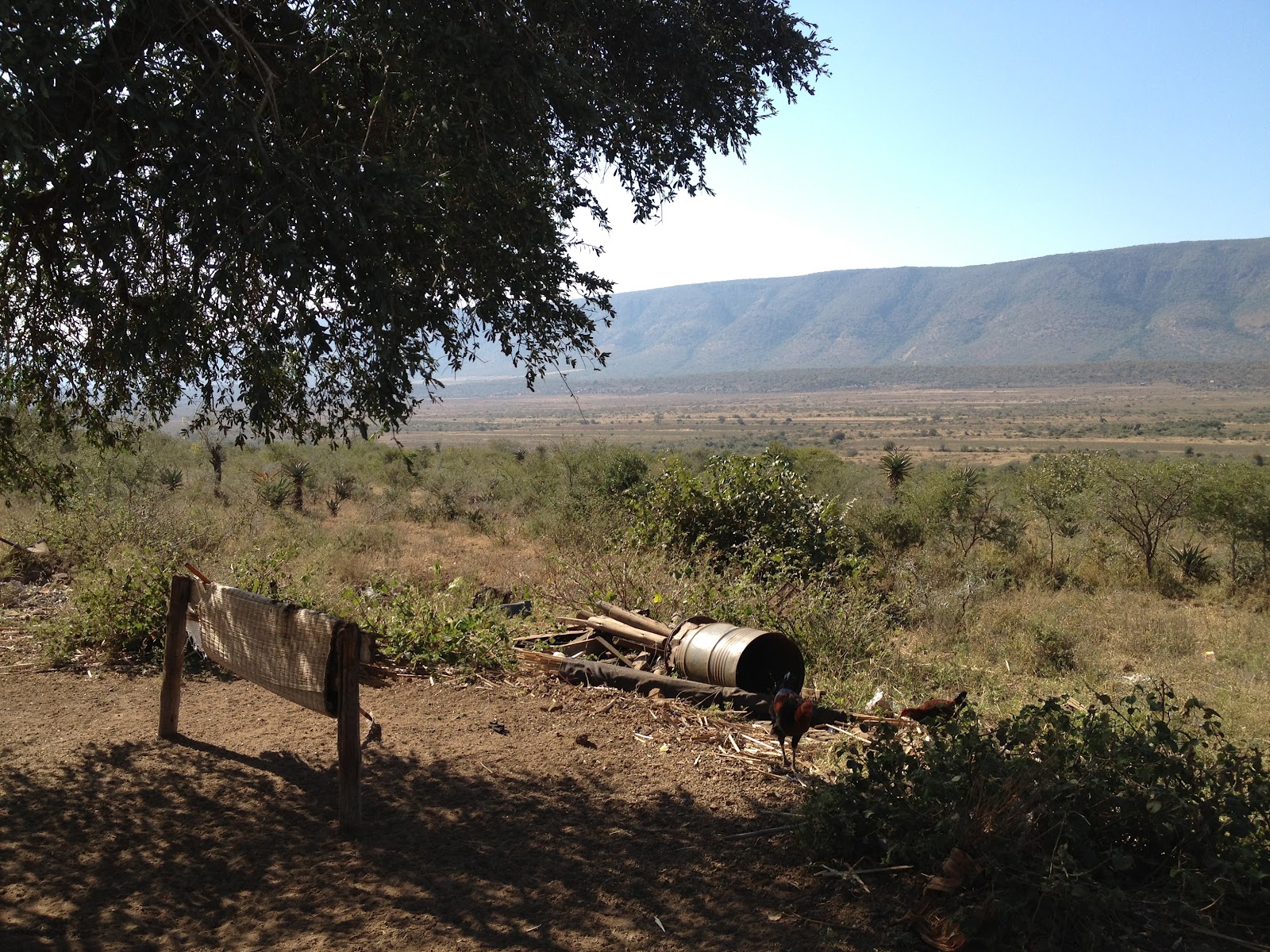 The view across the valley from the homestead & the loom where the 17 year old head of household makes grass mats to sell to earn money for her family. |
